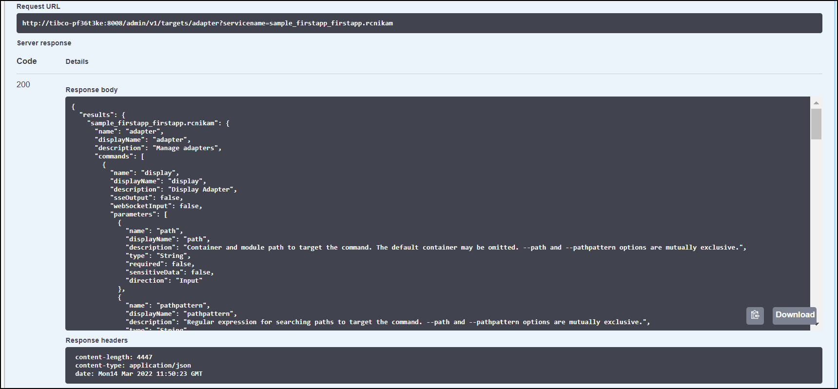 POST /targets/{target}— Run an administration command. From the REST API, enter The target name and The command name. Enter The service name for the target or command (optional). After you click Execute, the Responses body presents all information of target and command. For example: