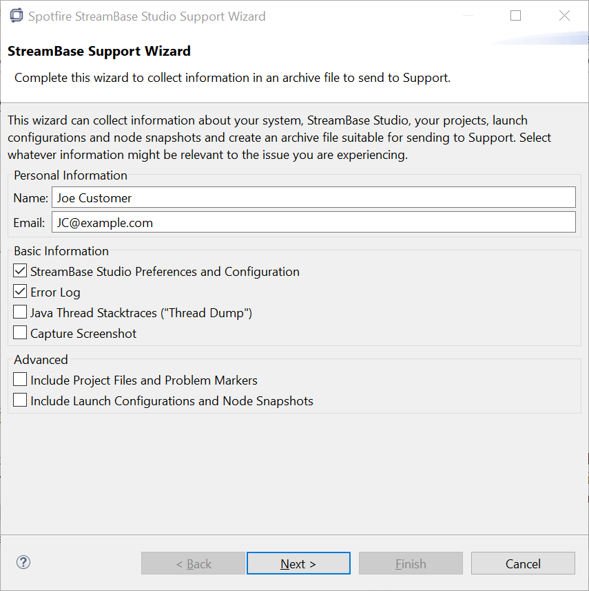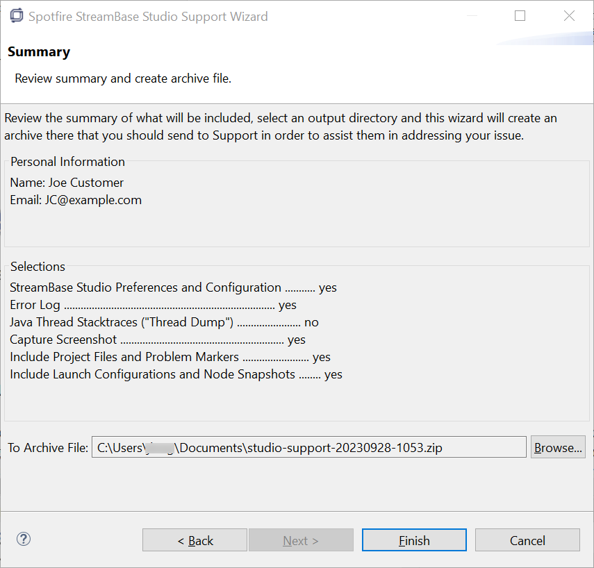 The StreamBase Support Wizard presents a dialog to capture relevant information for your system and applications, and bundle it into an archive (.zip) file. Once bundled, you can send the file to Support per local practice.