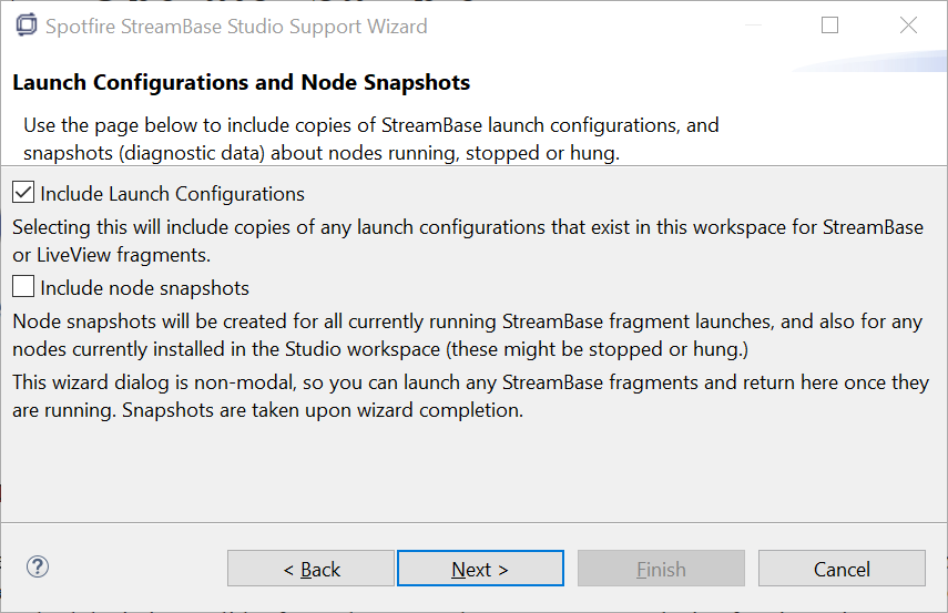 Click . In the Launch Configurations and Node Snapshots dialog, choose whether to include copies of StreamBase launch configurations, and snapshots (diagnostic data) about running or stopped nodes.