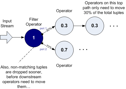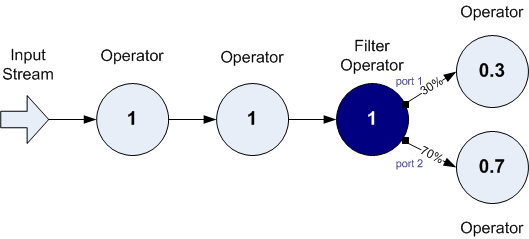 In the next example, consider the cost when you add a Filter operator on the right side (downstream) of the EventFlow. In this example, assume that the Filter operator's predicates and the inbound data values resulted in 30% of the tuples being moved out port #1, and 70% out port #2, to the next set of downstream components: