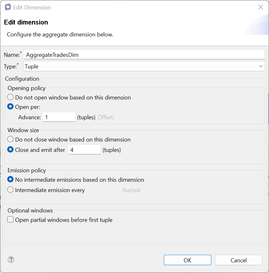 With a tuple-based dimension, a new window is opened and evaluated based on a specified number of arriving tuples. That is, a tuple containing the results of this operator's aggregation is emitted and the current window is closed when it contains a specified number of tuples. You can specify the number of tuples as a number or a constant parameter.