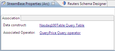 Selecting an arc between an operator and a data construct causes StreamBase Studio to display a read-only Association tab (shown below), that tells you about the association.