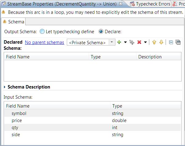 Select an arc to display its properties in the Properties view. Selecting an arc between two operators or between an operator and a stream causes StreamBase Studio to display a schema grid in the Schema tab, as shown below. By default, the fields shown in the grid represent the schema produced by typechecking the previous operator or stream and the input to the next operator or stream. By clicking the radio button, you may explicitly declare the arc’s schema. The most common reasons to declare an arc’s schema are breaking loops and reordering fields.
