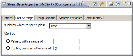 Choose this property if you want the sort to be bounded by the size of the buffer instead of the value of the sort field. Specify the buffer size as an integer. To see how a BSort by tuple works, step through the Example in this topic.