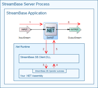 The Microsoft .NET operator interfaces to .NET code ("assemblies," compiled as DLLs) that you provide as part of a StreamBase application. The operator loads a client .NET assembly, instantiates a class within that assembly, passes to it incoming tuples, and optionally emits tuples provided by the .NET client code in return.