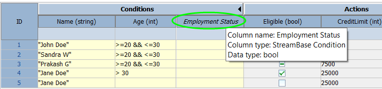 Cells within StreamBase condition columns can contain arbitrary StreamBase expressions ― with a few limitations ― that evaluate to boolean values. Expressions can reference one or more fields in the decision table operator's input schema. The limitations include: