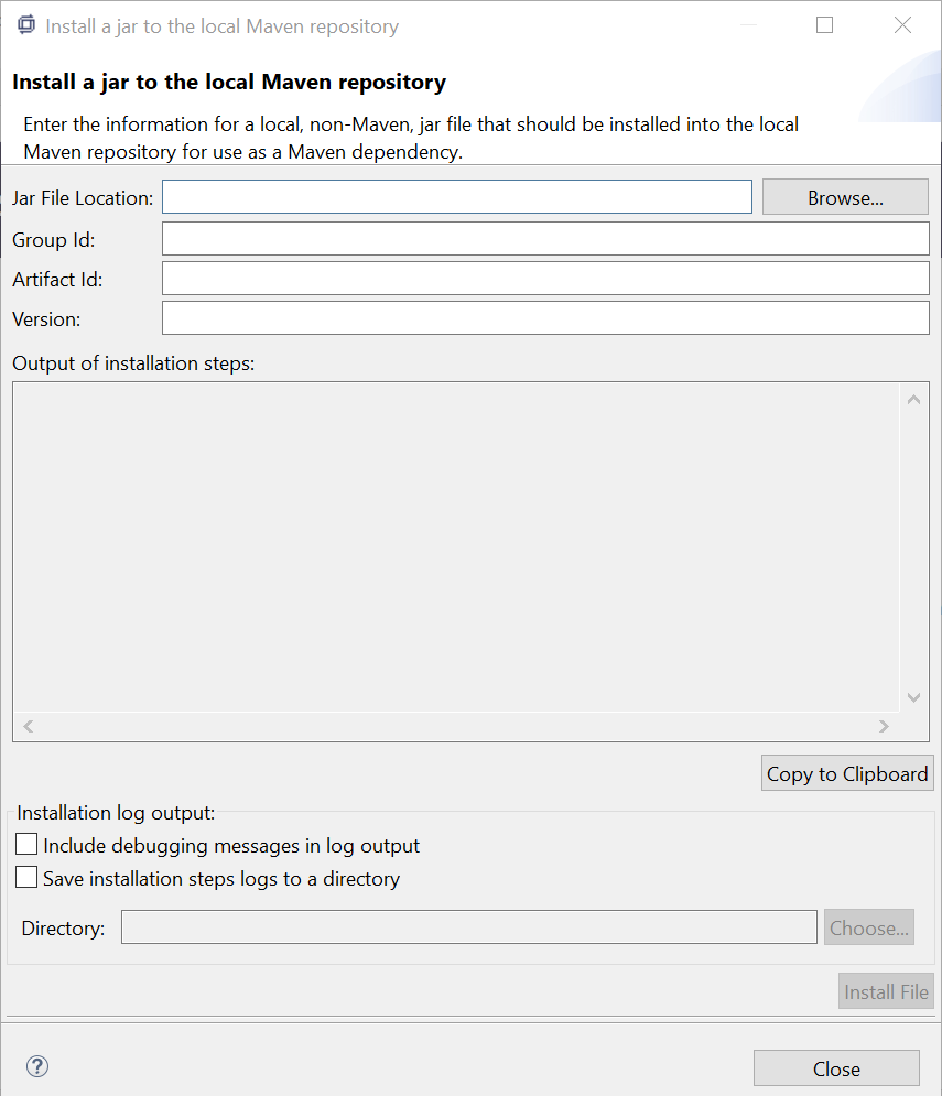 The Maven Install options are described in the next sections. To use either method, you must obtain the external JAR file from its vendor, and obtain, as far as possible, its exact groupId, artifactId, and version number.