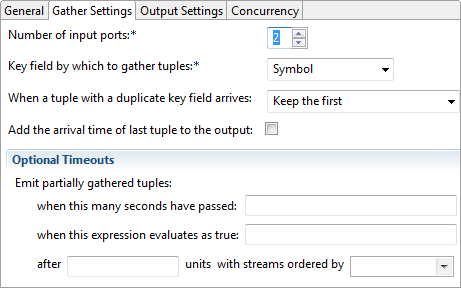 The Output Settings tab allows you to specify the schema of the operator's output tuple. Output tuples are released when the Gather operator has seen a tuple with a specific key value on each of the streams or a timeout occurs, as described above.