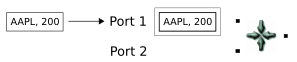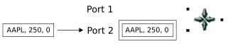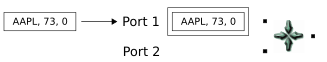 A tuple enters on the second port. This time, the conditions for the gather operation are met: the key field is matched by tuples on both input ports. In the gather operation, the volumes of the AAPL tuples are summed, the result is emitted in an output tuple, and the matching tuples are released from the buffer.