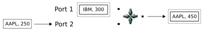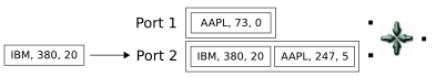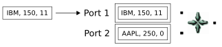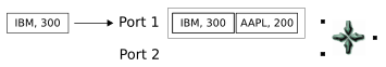 A tuple arriving on the second port matches a tuple on the first port, and Gather releases the result. Notice that the value of the output tuple is the sum of the last two key field values (289 and 350). The earlier IBM value of 300 will not be used: it is effectively lost in this Gather operation.