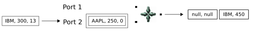 This step introduces the problem that can be caused by duplicate keys on the same stream. The new tuple's key field (IBM) matches the key field of an existing tuple on the same port. As you should expect, there is no output because the match did not occur on both ports. But notice in the figure that the new tuple replaces the existing tuple. In the next step, we will see how this affects the Gather result.