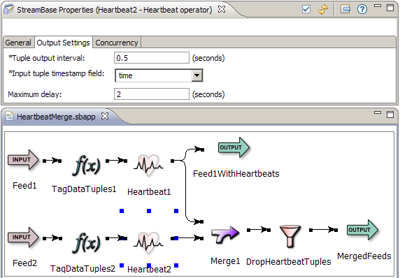 The following example EventFlow application uses two Heartbeat operators to prevent a Merge operator from starving when either of its inputs stop receiving tuples. Without the Heartbeat operators, the Merge operator would stop outputting tuples as soon as either of its two input streams becomes inactive, even if it continued to receive tuples on the other input stream.