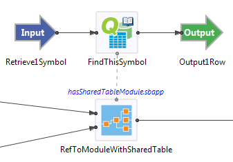 You can also associate a Query operator with a Module Reference that contains a shared Query Table. In this case, the Module Reference has the gray data connection port at the top of its icon.
