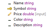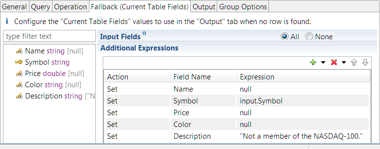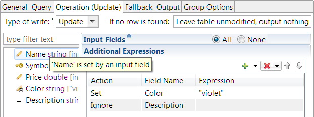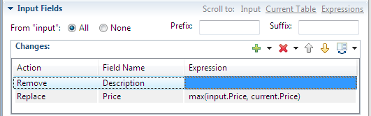 The following example of an edited Input Field grid shows that all fields in the input tuple are to be included as-is, except the Description field, which is removed. For the Price field, the operator compares the value in the input tuple with the value of the same-named field in the selected table row, and places the higher of the two prices in the output tuple.