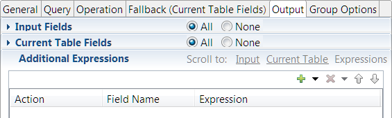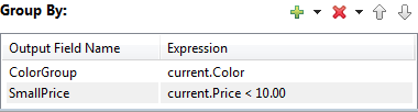 Any Group-By fields you specify in the Additional Expressions grid of the Output tab must be aggregate expressions. The aggregate expressions specify the calculations to be emitted for each specified group, such as a count() of rows or the avg() value of a field. For more information, see Using Aggregate Functions.