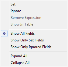 Select Fields | Click to open the Select Fields to Replace dialog that shows available fields for the Input Fields or Table Fields grids. Click the down arrow to select the alternate actions Include or Remove, which open the Select Fields to Include and Select Fields to Remove dialogs, respectively. |