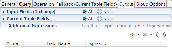 The changes you specify in this tab are applied in top-down order in two ways: top to bottom in the order of grids in the tab, and top to bottom in the order of field expressions in each grid. That is, the output tuple is assembled in the following way: