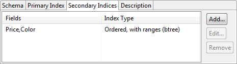 Use the Secondary Indexes tab to specify one or more secondary lookup fields for Query Tables that use this table schema. See the Secondary Indices tab for the Query Table data construct for further details on defining a secondary index.