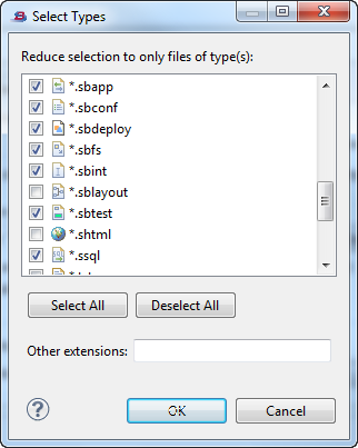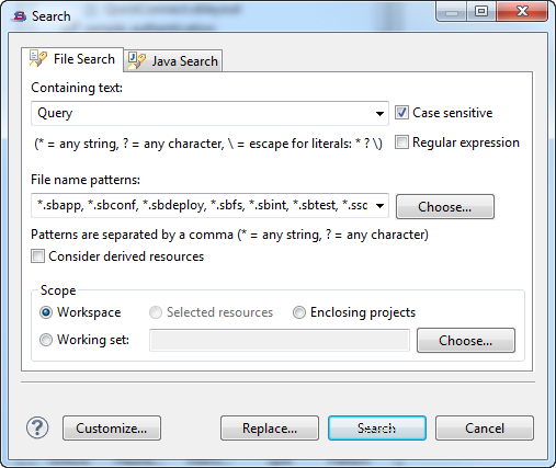 To make the Eclipse File Search feature useful in the StreamBase Studio context, use the first button to restrict the search to the StreamBase file types of interest.