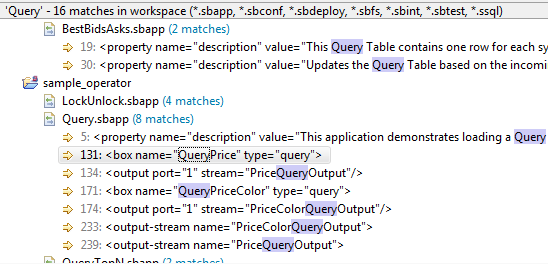 After a search, results are show in the Eclipse Search view. Notice in the following example that the search locates the search term in the underlying XML of EventFlow files, which you can use to rule out certain found locations. For example, if you are looking for a Query operator with "Query" in its name, you can rule out the first three entries in the example below, where "Query" was found in Description text.