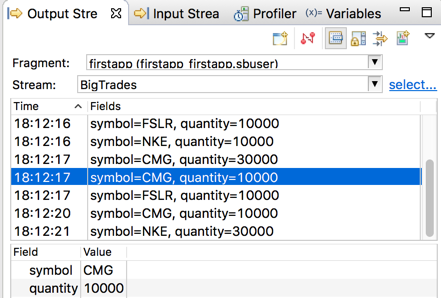 BigTradesfrom the Stream dropdown. Verify that the quantity value is always above 10000 for entries in the list.Tip