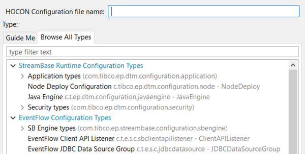 To view a list of every available configuration type, click the Browse All Types tab. Enter a search string in the type filter text field to reduce the list to types that match that string.