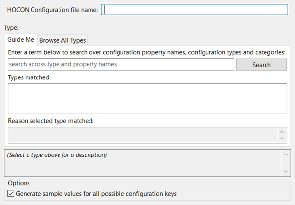 When creating a configuration file, the Editor presents the option to generate every available configuration property for the specified HOCON configuration type. These properties, when generated, include descriptive comments.
