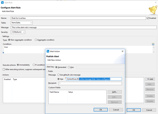 To see alert rule substitutions in action, load and run the Hello LiveView sample. The sample contains two alerts with field