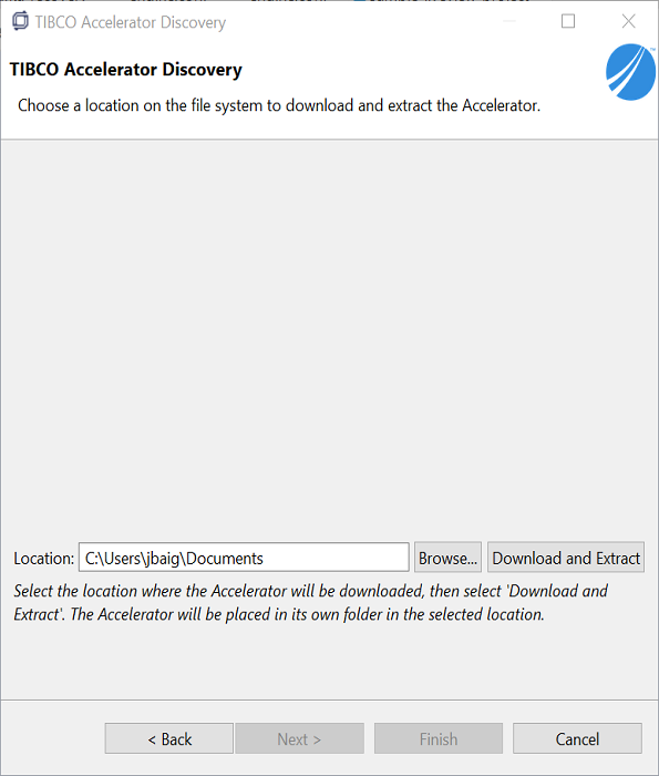 A window showing Choose a location on the file system appears. Browse the location where the Accelerator will be downloaded, then select Download and Extract.