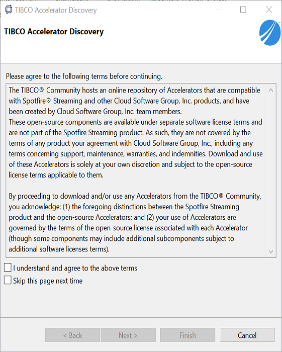 To download Accelerators from Studio, select >from Studio's top-level menu. A initial license page like the following appears.