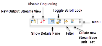 The buttons on the Output Streams view's toolbar are used as shown in the following illustration.