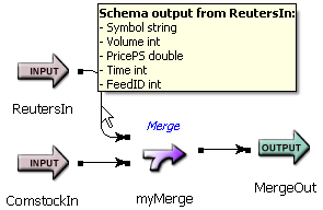 For quickly viewing properties without modifying them, StreamBase provides an extensive set of tooltips. If tooltips are enabled (the default setting), StreamBase Studio displays key properties for each component when you hover your cursor over it (sometimes called mouseover). The contents of each tooltip depends on the component type and the location of the cursor on the component's icon.