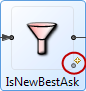 For operators that have a user-controlled number of ports (including Split, Union, Filter, Gather, and Pattern), you can drag an arc to or from a hover port that appears in gray in the bottom right corner while the mouse hovers over the operator. The hover port for a Filter operator is circled in red in the following illustration: