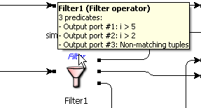 For the Filter operator, the tooltip displays the predicate (boolean expression) that corresponds to each output port.