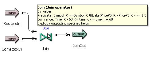 For the Join operator, the tooltip tells you that the join is by value (instead of by tuples), shows the predicate (boolean expression) to be applied, and all the other settings defined in the Properties view.