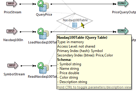 For the Query Table, the tooltip tells you the location of the table's storage (in heap, disk, or transactional memory), as well as its index fields and schema.