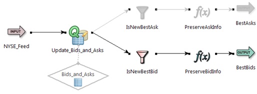 Disabling an arc prevents tuples from reaching the end of the arc, and automatically disables all downstream components. Disabled arcs can still have breakpoints. Disabled components are shown dimmed in gray on the EventFlow canvas, as in the following example: