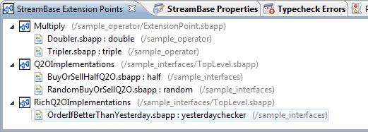 The ExtensionPoint.sbapp sample is part of the operator group of samples included in StreamBase. This simple module implements the Multiplier.sbint interface with an Extension Point named Multiply. The Extension Point has two module instances, Doubler.sbapp and Tripler.sbapp, which double and triple their integer input, respectively.
