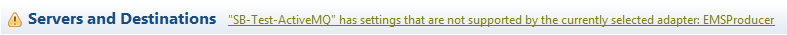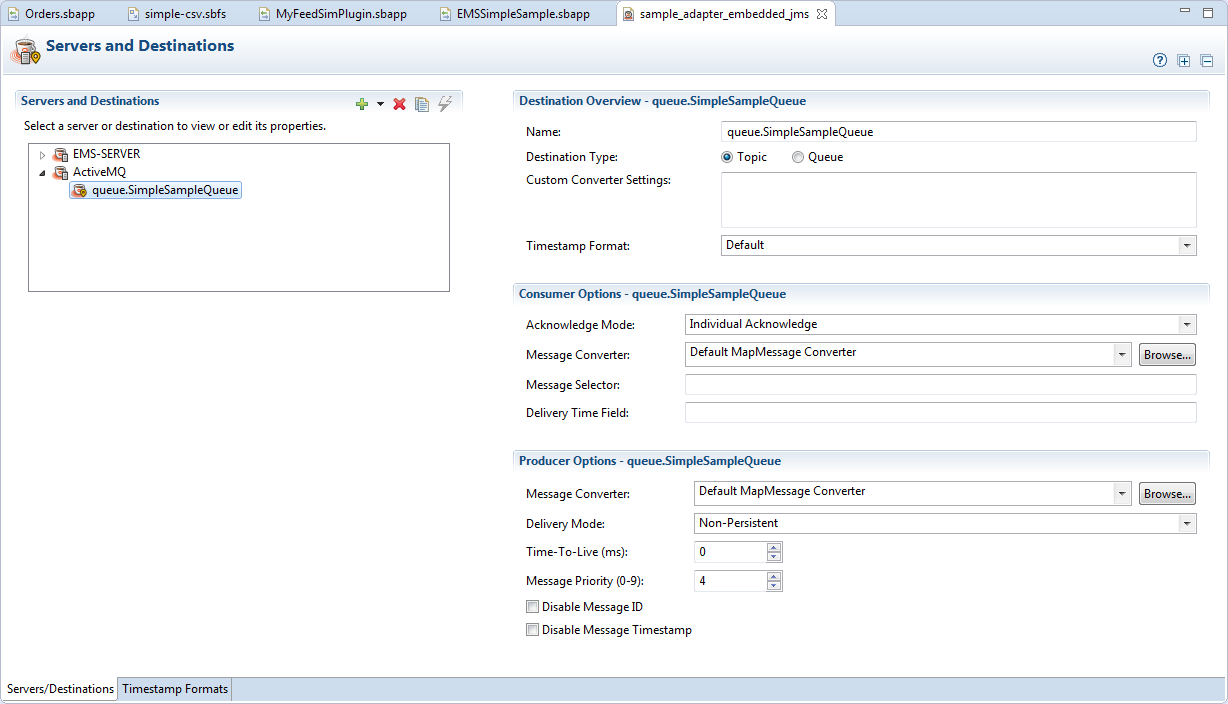Configure one set of JMS or EMS server and destination connections at a time. Both sets can successfully co-exist in the same configuration file, but only one set can be edited at a time.