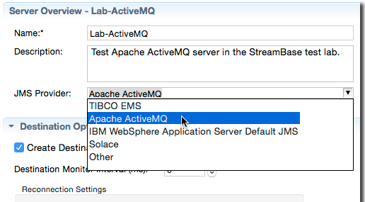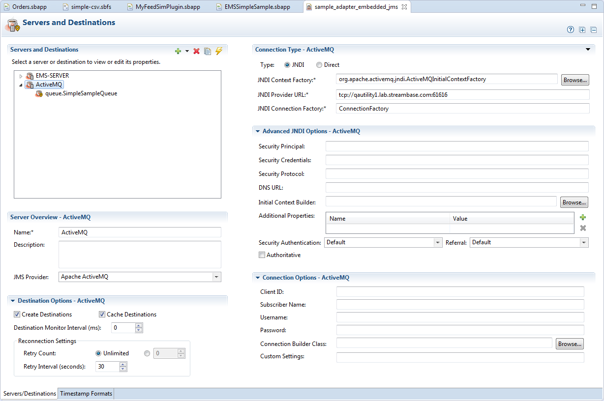 The Server/Destinations tab allows for maximum flexibility in configuring JMS server and destination definitions, and allows for many special-case settings. At first glance, the number of fields in this tab can appear daunting. However, to make a successful connection to a JMS or TIBCO EMS message server requires only a few settings.