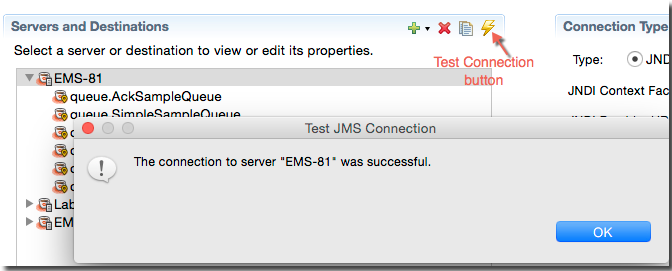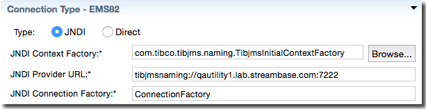 See Connection Type Section, JNDI and Connection Type, Direct below for examples and explanations of the fields you must configure in the Connection Type section to allow a simple JMS or EMS connection to proceed.