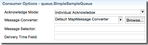 | Acknowledge Mode | The mode used to acknowledge JMS messages for the selected destination. Defaults to Individual Acknowledge. You can also select Dups OK Acknowledge, Client Acknowledge, or Auto-Acknowledge.