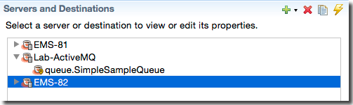 Use the Server/Destinations tab to define connection configurations for JMS and TIBCO EMS servers, and to configure destinations for defined servers. This tab takes on a different look, depending on what it is currently editing: