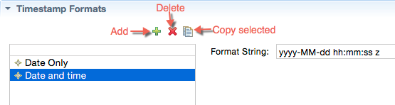 The Timestamp Format tab has the single purpose of defining named timestamp formats that can be assigned in the configuration of destinations.