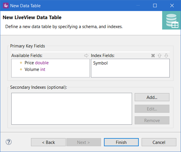 The New LiveView Data Table wizard is the first wizard you encounter when creating a new LiveView project.