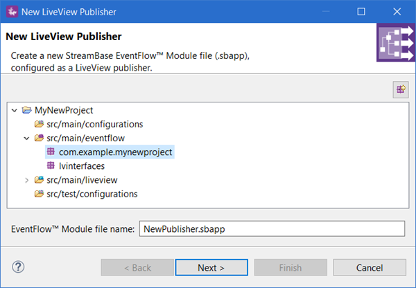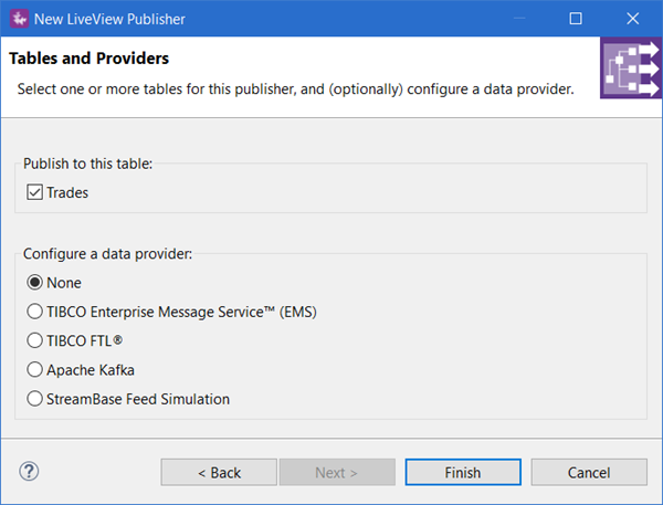 Use the New LiveView Publisher wizard to create a publishing EventFlow application that publishes data to one or more Data Tables.