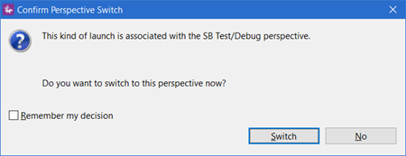 By default, running or debugging a StreamBase module with a Run Configuration automatically switches StreamBase Studio to the SB Test/Debug perspective, after prompting you to confirm. You can specify on the prompt dialog to not ask again.