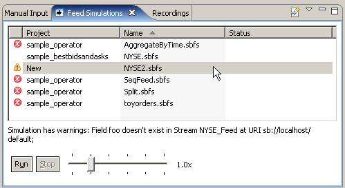 If you have many feed simulations in your workspace, you may see a progress bar in the Feed Simulations view as it loads. StreamBase Server validates each feed simulation in the workspace against the input streams defined in the running application. Feed simulations can be shared between applications and projects, and are not tied to a particular application. However, to successfully run a feed simulation, each stream name configured in the feed simulation file must match an input stream name in the running application.