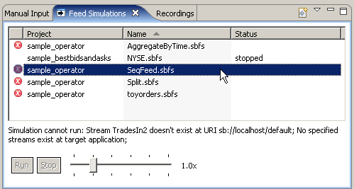 The red icon indicates that the simulation was designed for another application that uses different stream names. Select a feed simulation row to see message text below the grid explaining why that simulation cannot run with the current application.
