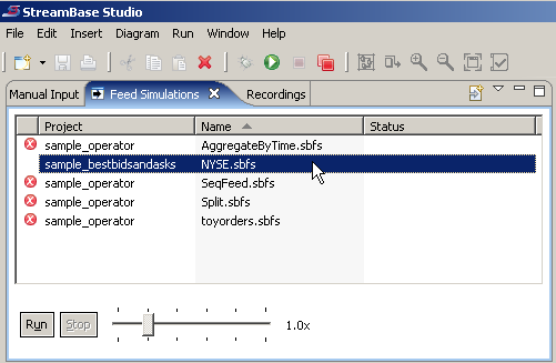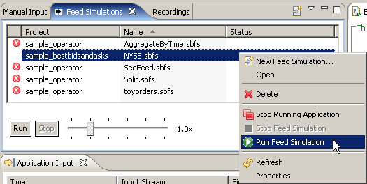 To run the NYSE.sbfs feed simulation, select it and click the button. Another way to start it is to right-click the feed simulation file name, and select Run Feed Simulation from the dropdown menu.
